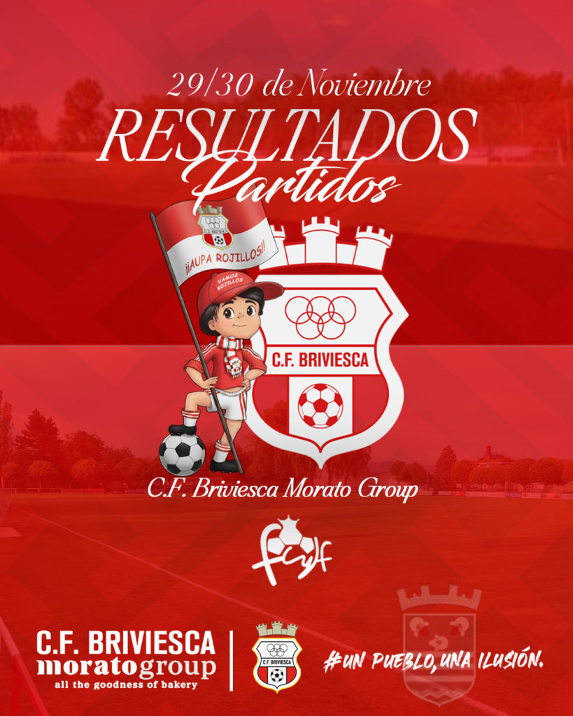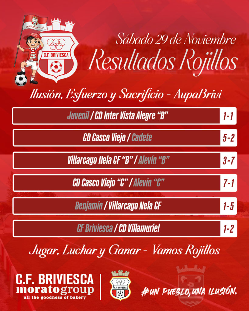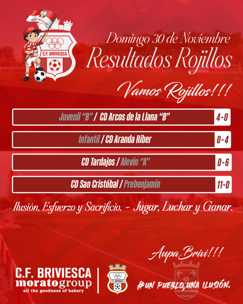 RESULTADOS CF BRIVIESCA 2 diciembre, 2025Anuncios , Crónicas de partidos , Eventos , Prensa , Últimas noticias Cantera Rojilla | Primer Equipo RESULTADOS #cfbriviesca Finde lleno de compromiso, esfuerzo y entrega rojilla Orgullosos de nuestros jóvenes que siguen creciendo, aprendiendo, compitiendo y defendiendo los colores rojillos con pasión, entrega y corazón #CanteraRojilla #OrgulloRojillo #VamosRojillos